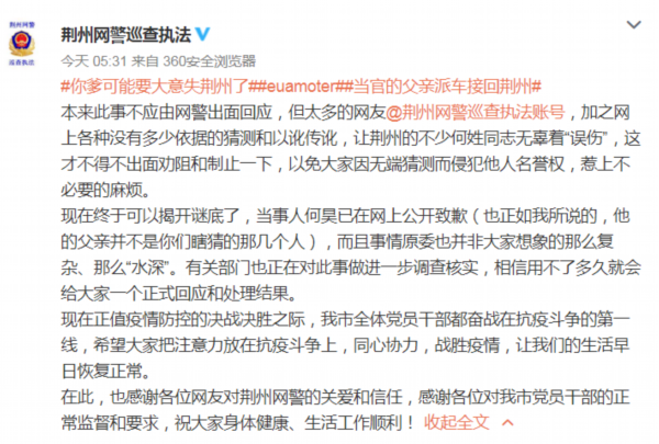 相关报道>>男子发文称“当官的父亲派车接回荆州” 多部门调查