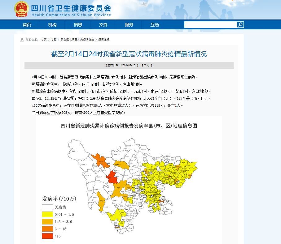 截至2月14日24时,四川省累计报告新型冠状病毒肺炎确诊病例470例,涉及21个市(州)、127个县(市、区)。
