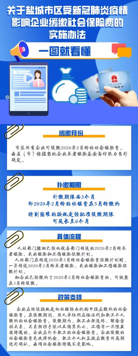 2月14日,根据省、市相关文件精神,盐城市人社局、市税务局、市财政局出台了《关于盐城市区受新冠肺炎疫情影响企业缓缴社会保险费的实施办法》(盐人社发〔2020〕14号),全文如下