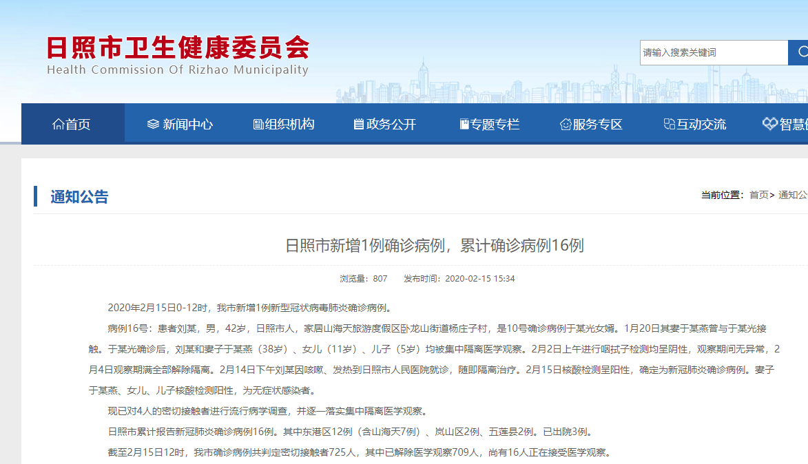 荔枝新闻讯 2月15日下午,山东日照市卫生健康委员会发布消息,2020年2月15日0-12时,我市新增1例新型冠状病毒肺炎确诊病例。