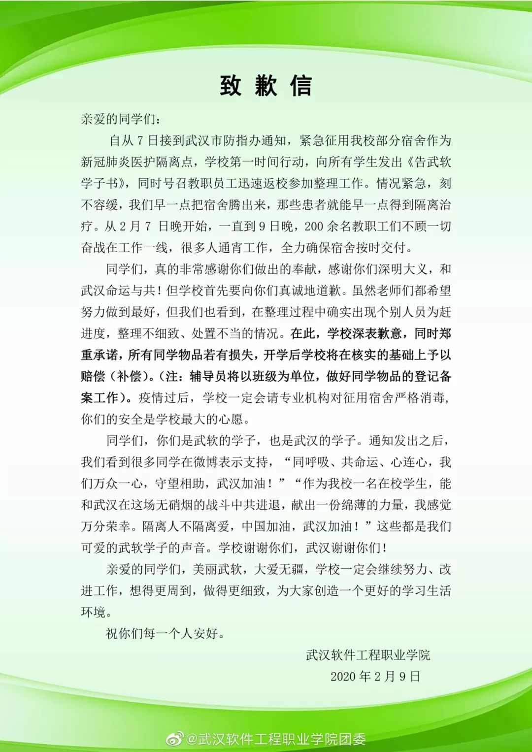致歉信中提到,学院是从7日接到了武汉市防指办通知,紧急征用该校部分宿舍作为隔离点。