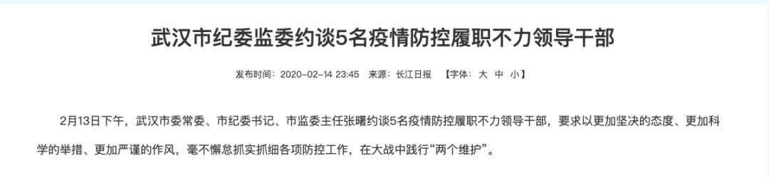 其三,这是疫情发生以来,在公开报道中,武汉市纪委首次约谈干部。