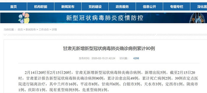 荔枝新闻讯 2月14日20时至2月15日20时,甘肃无新增新型冠状病毒肺炎确诊病例。新增出院5例。截至2月15日20时,甘肃累计报告新型冠状病毒肺炎确诊病例90例,累计治愈出院49例,累计死亡病例2例。39例在定点医院进行隔离治疗,其中兰州市16例、平凉市8例、甘南州6例、白银市3例、天水市3例、定西市1例、陇南市1例、庆阳市1例。现有重型病例5例,危重型病例1例。