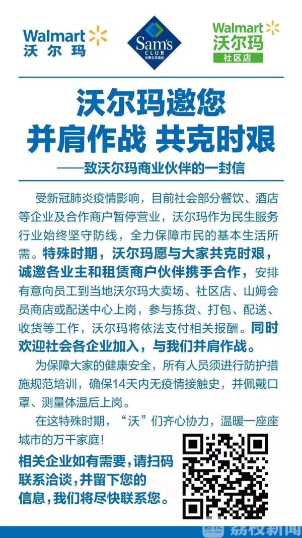 《沃尔玛邀您并肩作战 共克时艰》的电子海报在朋友圈传播开,这是沃尔玛致商业伙伴的一封“战时邀请信”。疫情当前,民生商品急需保障。面对巨大的人员需求压力,沃尔玛果断推出“共享员工”策略,诚邀暂时歇业的职员去沃尔玛“上班”。来自江西萍乡的小易正是在这样的背景下去沃尔玛“上班”的一名共享员工。半个月前,他还是绿茶餐饮店的配菜师傅。如今,他的新身份是沃尔玛新街口店电商部门的拣货员。
