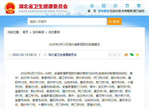 荔枝新闻讯 据湖北省卫健委通报,2020年2月15日0—24时,全省新增新冠肺炎确诊病例1843例(含临床诊断病例888例),其中:武汉市1548例、孝感市87例、潜江市50例、鄂州市38例、天门市25例、随州市22例、襄阳市16例、荆州市12例、咸宁市12例、仙桃市9例、黄石市8例、荆门市7例、黄冈市6例、十堰市5例、恩施州3例、宜昌市核减5例。全省新增病亡139例,其中:武汉市110例、黄冈市7例、宜昌市6例、荆州市4例、孝感市3例、随州市3例、荆门市2例、黄石市1例、襄阳市1例、鄂州市1例、潜江市1例。全省新增出院849例,其中:武汉市413例、黄冈市105例、荆州市71例、宜昌市48例、孝感市40例、襄阳市29例、咸宁市25例、仙桃市24例、鄂州市23例、黄石市22例、随州市17例、十堰市16例、天门市6例、荆门市5例、恩施州5例。