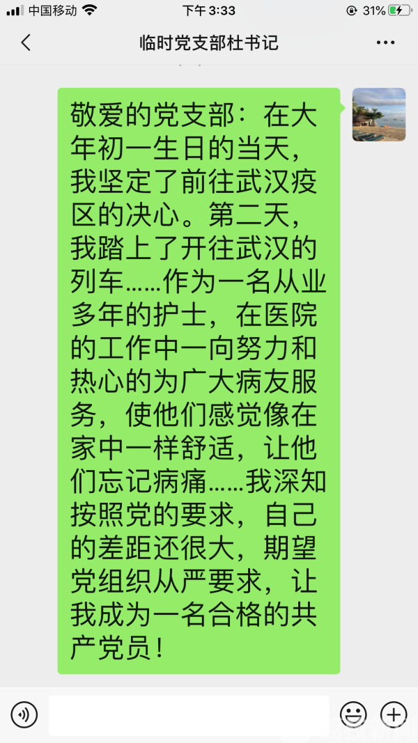 “我深知按照党的要求,自己的差距还很大,期望党组织从严要求,让我成为一名合格的共产党员要经得起党组织的考验,成为一名真正合格的党员!”这是张年在医院里,抽空给临时党支部书记发的一条微信。