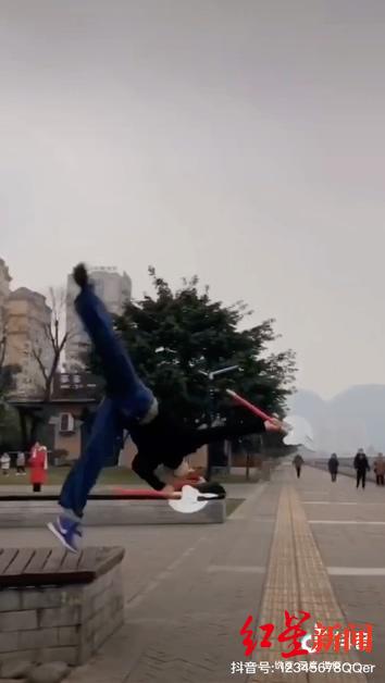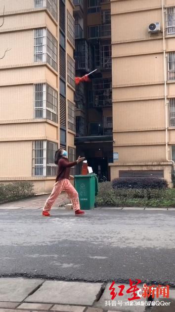 视频中,一名戴着口罩的女子走出楼栋单元门,她穿着深色毛衣和粉色花睡裤,脚着棉鞋,显得有些慵懒。两只手都没空着:左手是纸箱,右手则拿着一柄长剑。走近垃圾箱时,只见女子一只手朝垃圾箱掷出纸箱,另一只手将剑抛向天空,再接住后,往前一个冲跑,然后空翻双腿呈一字,落地后又一阵腾闪挪移和跃起,行云流水地舞起宝剑。最后,女子拿住剑背身,信步走回楼栋。视频结束,总共才32秒。