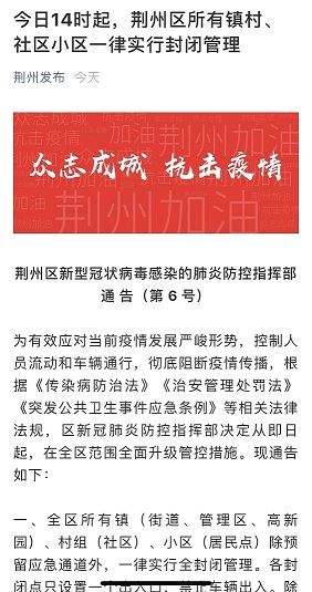 荔枝新闻讯 据荆州市荆州区新型冠状病毒感染的肺炎防控指挥部消息,决定自2020年2月16日14:00起,全区所有镇(街道、管理区、高新园)、村组(社区)、小区(居民点)除预留应急通道外,一律实行全封闭管理。