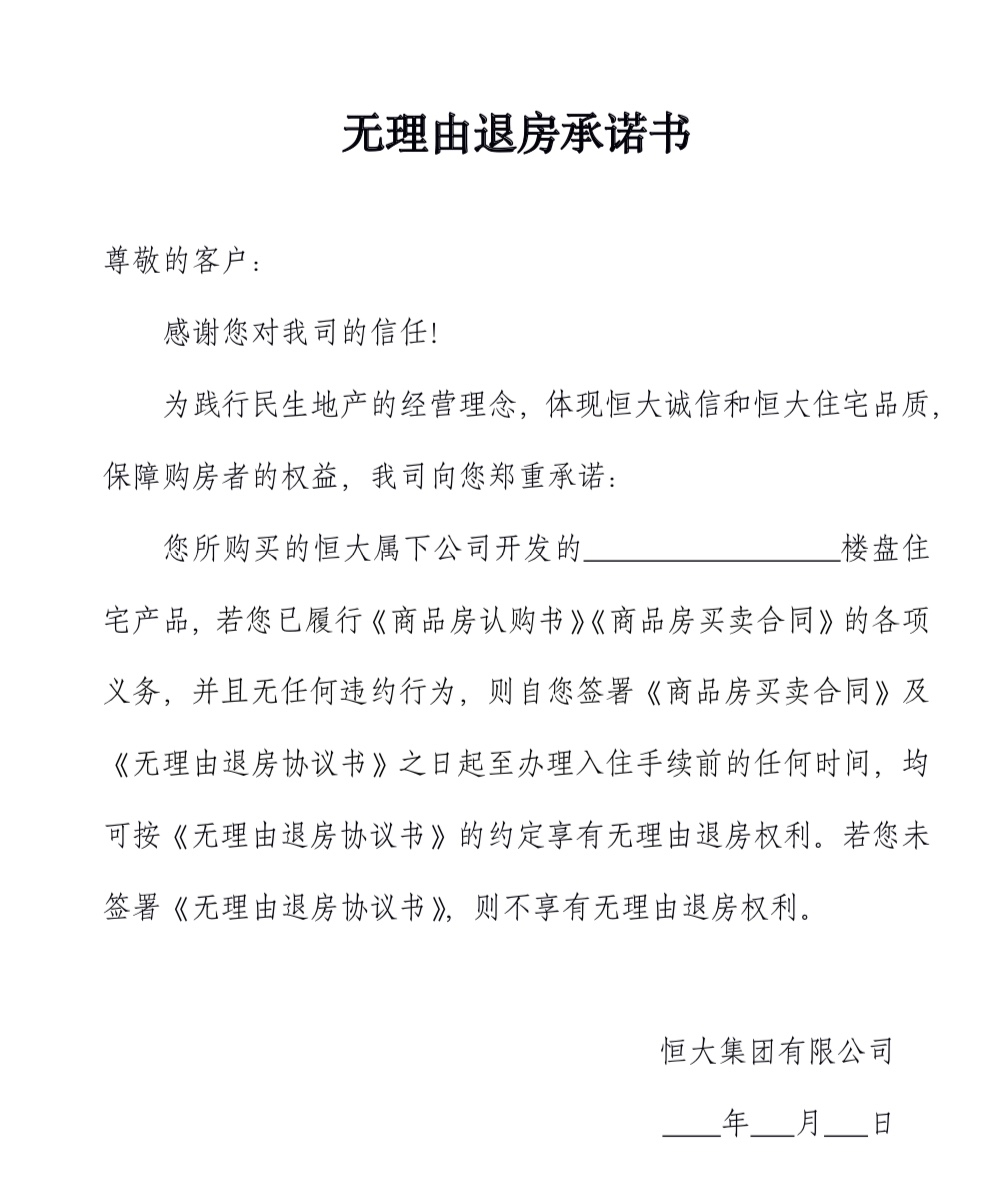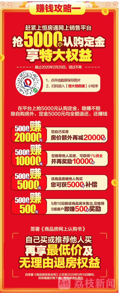 根据相关政策,购房者只需在“恒房通”平台线上缴纳5000元定金并签署《商品房网上认购书》,即可在全国恒大楼盘预定房源。自签署《商品房买卖合同》之日起至5月10日,便享有“最低价购房”权益。也就是说,如购买楼盘价格下调,可获补差价,并可享受“无理由退房”权益保证,保证消费者"稳赚不赔"。