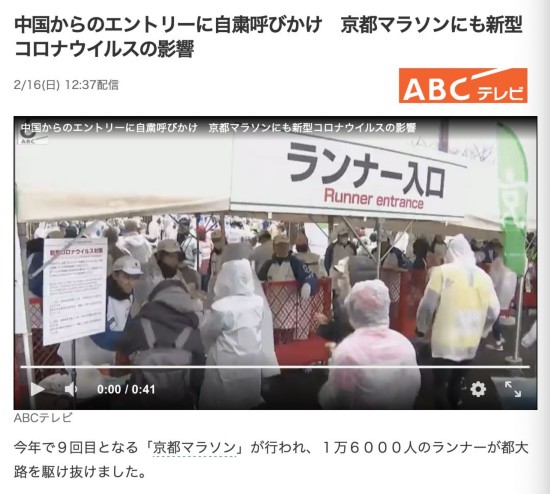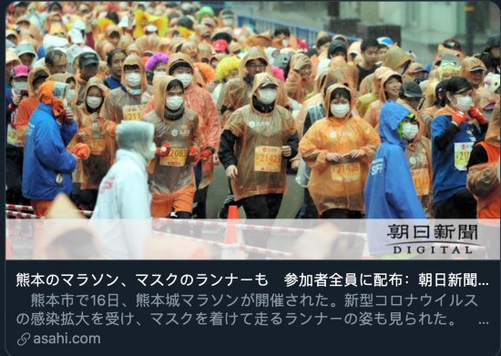 据日本朝日新闻,在熊本市召开的马拉松大会上,有的参赛选手也佩戴了口罩,大赛实行委员会也向所有参赛者发放了口罩。