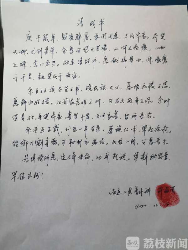 “庚子鼠年,冠疫肆虐。举国同悲,万民齐哀。荆楚大地,尤创甚深……”这是来自南通市第二人民医院的一份请战书。让人意想不到的是,这份文言请战术,竟然出自一位拿刀的外科医生之手。