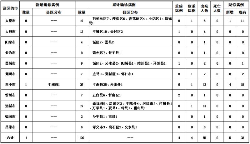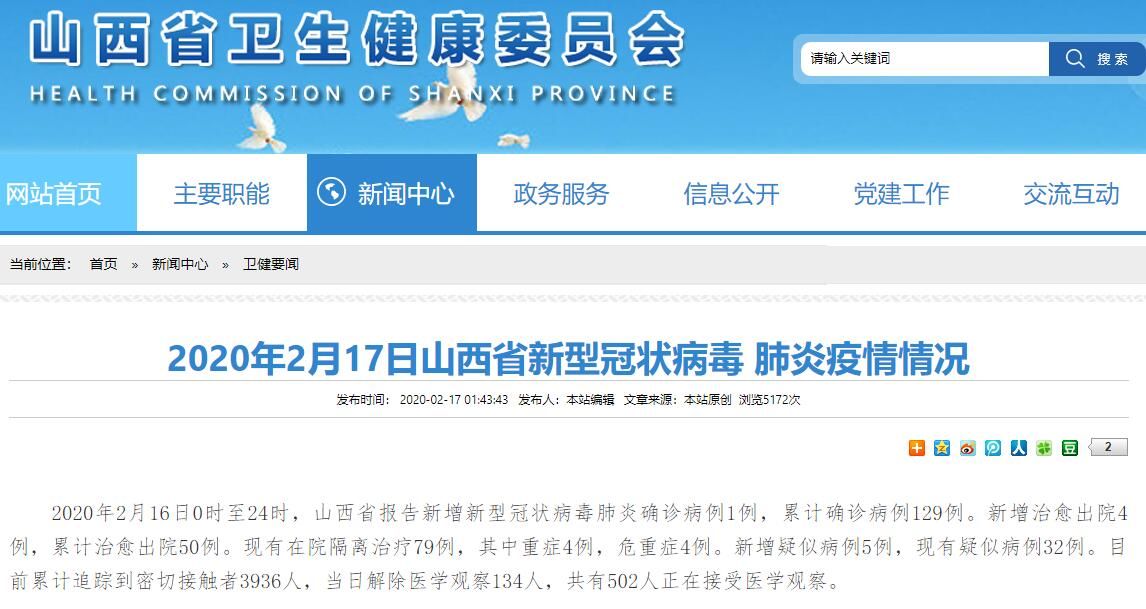 荔枝新闻讯 据山西省卫健委官方消息,2月16日0时至24时,山西省报告新增新型冠状病毒肺炎确诊病例1例,累计确诊病例129例。新增治愈出院4例,累计治愈出院50例。现有在院隔离治疗79例,其中重症4例,危重症4例。新增疑似病例5例,现有疑似病例32例。目前累计追踪到密切接触者3936人,当日解除医学观察134人,共有502人正在接受医学观察。