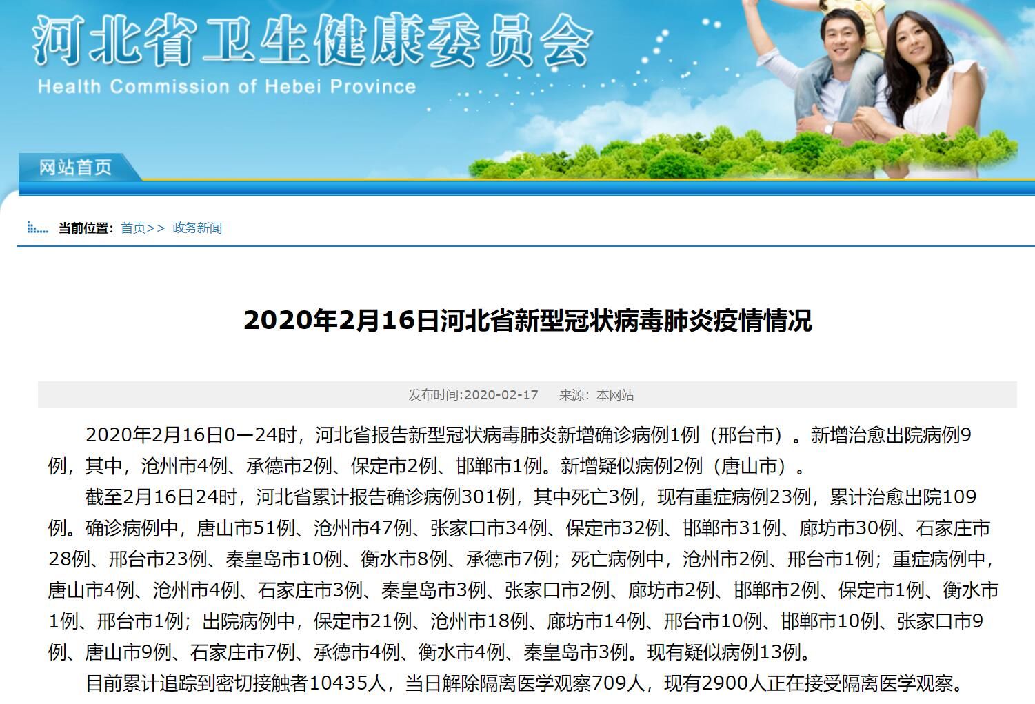 荔枝新闻讯 据河北卫健委官方网站截图,2020年2月16日0—24时,河北省报告新型冠状病毒肺炎新增确诊病例1例(邢台市)。新增治愈出院病例9例,其中,沧州市4例、承德市2例、保定市2例、邯郸市1例。新增疑似病例2例(唐山市)。