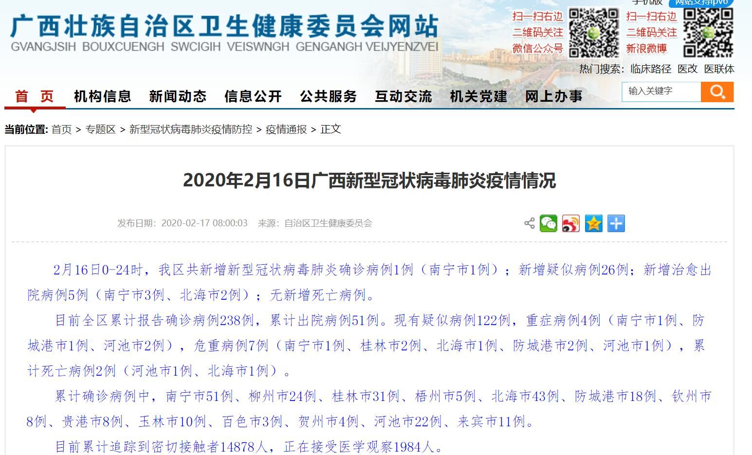 目前广西全区累计报告确诊病例238例,累计出院病例51例。现有疑似病例122例,重症病例4例(南宁市1例、防城港市1例、河池市2例),危重病例7例(南宁市1例、桂林市2例、北海市1例、防城港市2例、河池市1例),累计死亡病例2例(河池市1例、北海市1例)。