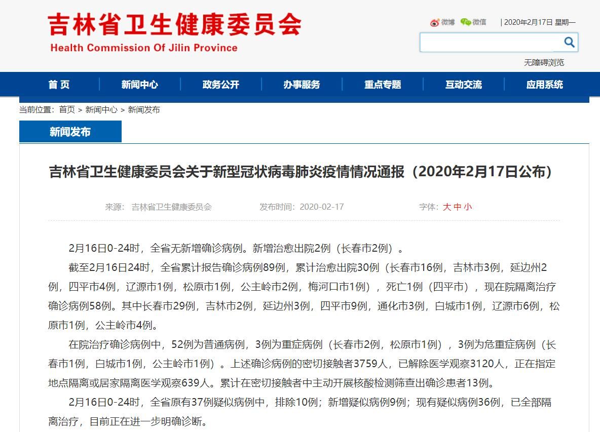 截至2月16日24时,全省累计报告确诊病例89例,累计治愈出院30例(长春市16例,吉林市3例,延边州2例,四平市4例,辽源市1例,松原市1例,公主岭市2例,梅河口市1例),死亡1例(四平市),现在院隔离治疗确诊病例58例。其中长春市29例,吉林市2例,延边州3例,四平市9例,通化市3例,白城市1例,辽源市6例,松原市1例,公主岭市4例。