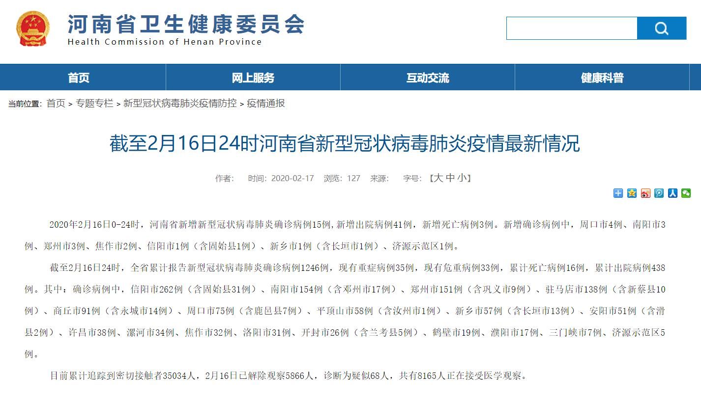截至2月16日24时,全省累计报告新型冠状病毒肺炎确诊病例1246例,现有重症病例35例,现有危重病例33例,累计死亡病例16例,累计出院病例438例。其中:确诊病例中,信阳市262例(含固始县31例)、南阳市154例(含邓州市17例)、郑州市151例(含巩义市9例)、驻马店市138例(含新蔡县10例)、商丘市91例(含永城市14例)、周口市75例(含鹿邑县7例)、平顶山市58例(含汝州市1例)、新乡市57例(含长垣市13例)、安阳市51例(含滑县2例)、许昌市38例、漯河市34例、焦作市32例、洛阳市31例、开封市26例(含兰考县5例)、鹤壁市19例、濮阳市17例、三门峡市7例、济源示范区5例。