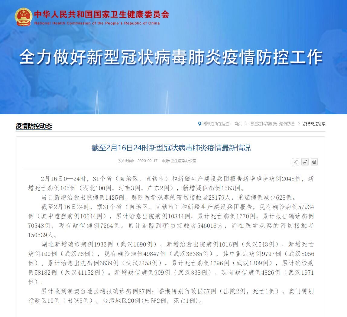 荔枝新闻讯 据国家卫健委官方网站消息,2月16日0—24时,31个省(自治区、直辖市)和新疆生产建设兵团报告新增确诊病例2048例,新增死亡病例105例(湖北100例,河南3例,广东2例),新增疑似病例1563例。