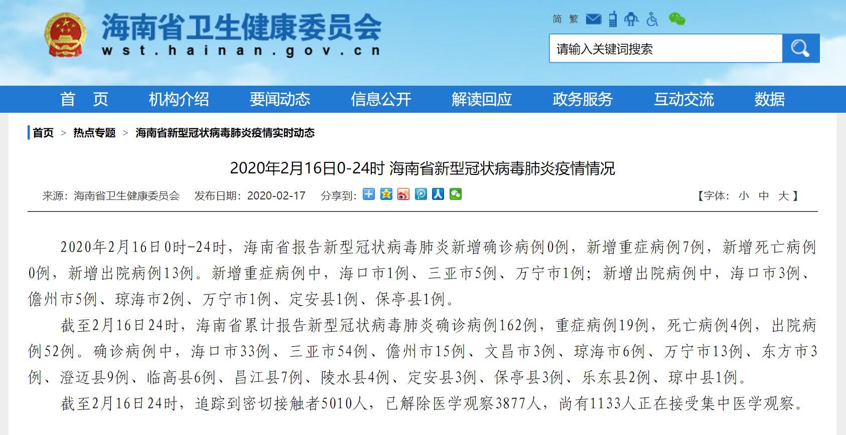 截至2月16日24时,海南省累计报告新冠肺炎确诊病例162例,重症病例19例,死亡病例4例,出院病例52例。确诊病例中,海口市33例、三亚市54例、儋州市15例、文昌市3例、琼海市6例、万宁市13例、东方市3例、澄迈县9例、临高县6例、昌江县7例、陵水县4例、定安县3例、保亭县3例、乐东县2例、琼中县1例。