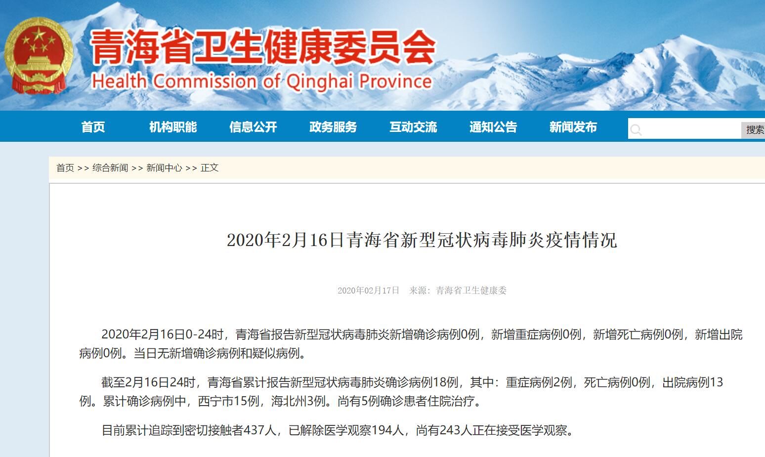 荔枝新闻讯 据青海卫健委官方网站消息,2020年2月16日0—24时,青海省报告新型冠状病毒肺炎新增确诊病例0例,新增重症病例0例,新增死亡病例0例,新增出院病例0例。当日无新增确诊病例和疑似病例。