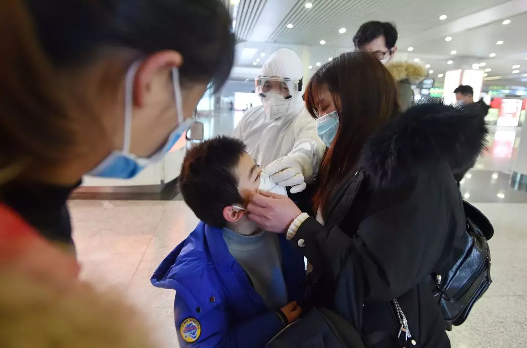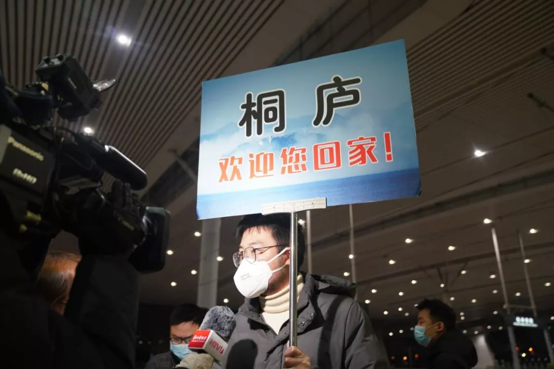 到达层,有一家四口俩小孩,母亲说,在车上乘务员给自己的两个孩子教怎样正确的戴口罩,小儿子戴反了,还给孩子换了个新的,“温馨得很”。