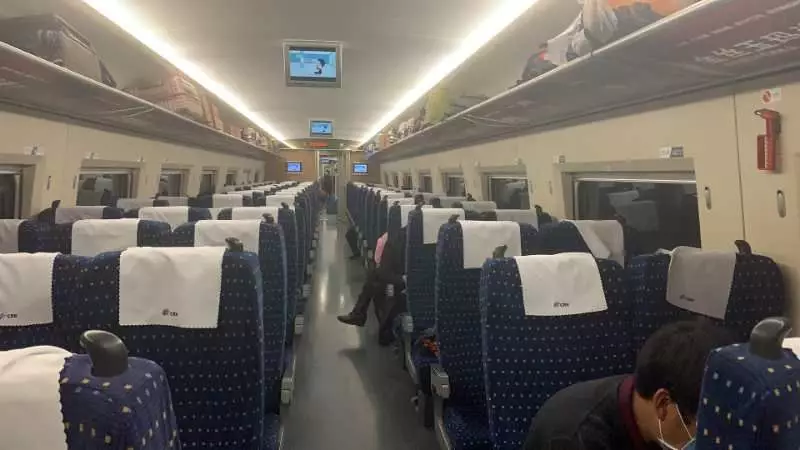 G4138次列车上,乘务工作人员组织复工旅客分散就坐,减少在车厢内走动次数。