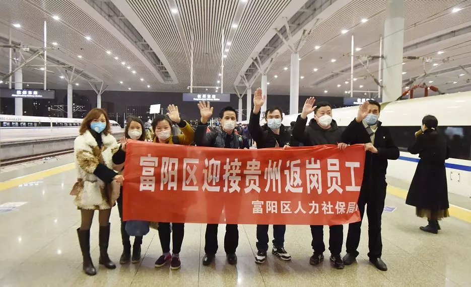 近300名员工来自杭州的60余家企业。杭州对所有乘车的复工人员做好了“健康码”的审核,组织符合健康要求的员工佩戴口罩进站乘车。下午在贵阳北站,铁路部门开辟绿色通道,指定专人引导进站,安排30余人、12台设备加强体温检测,并设置候车专区分散就坐。