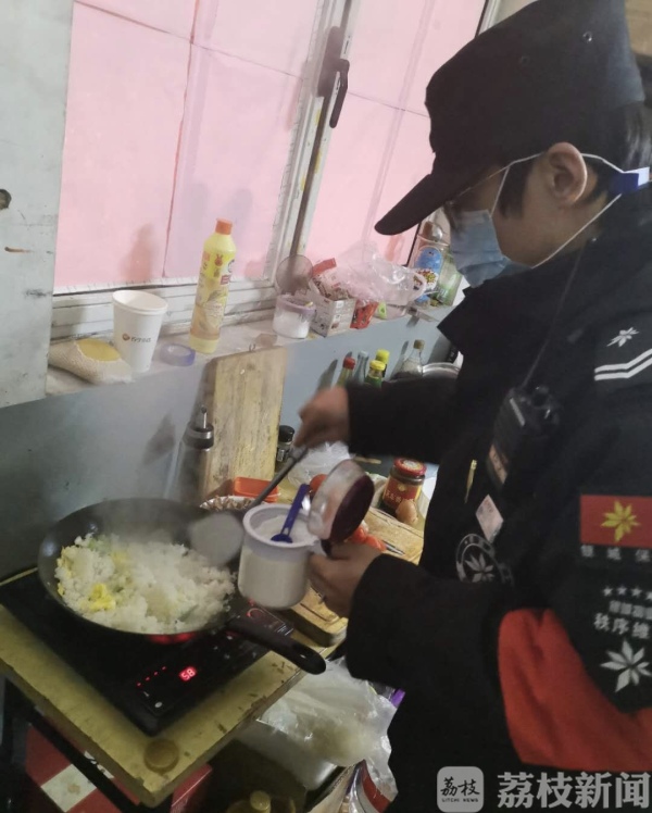 特殊时期,在小区抗疫一线值守的同事们,吃饭成了难题,小李子主动负责起项目上10位同事每天中午和晚上的“伙食”。他说,“在疫情防控期,我就想让大家吃得健康又暖和”。今天做个蛋炒饭,明天下个水饺、做个单人份小火锅,尽可能地换着口味来。每天做好饭,他会先给大家送过去,然后再回到自己的岗亭里吃饭。自己留的饭菜不够了,他就啃馒头或包子,再来点“老干妈”,还笑着说:“还不够辣!”