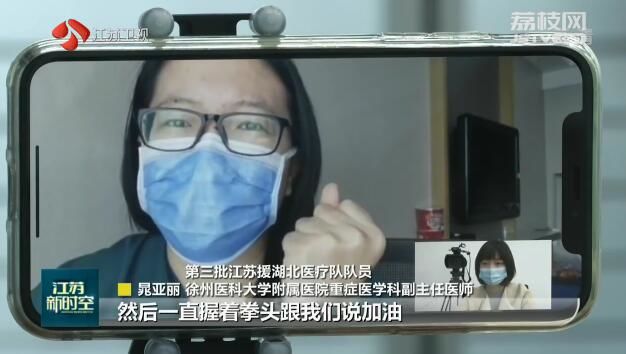 第三批江苏援湖北医疗队队员、徐州医科大学附属医院重症医学科副主任医师晁亚丽说:“本来就是说基本上不想活动的,但是当那天我去查房的时候,病人很激动,然后一直握着拳头跟我们说加油,我一定能胜利。后来他们护士说,然后病人能够很好地去配合,慢慢下床活动。”