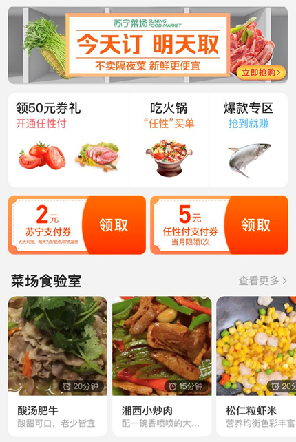 订单生成后,只需要等到第二天一早就能在家附近的苏宁小店内直接自提。目前,苏宁小店均已采用“无接触自提”取菜模式,同时店内的一线工作人员均经过每日严格的体温监测,店内公共区域“一日三餐”式的杀菌消毒工作也毫不懈怠。在特殊时期给顾客更安心的消费体验,成为每一家苏宁小店的营业标准。