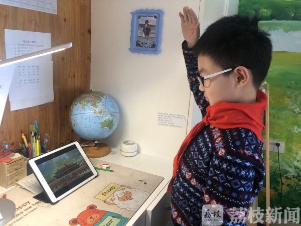 今天一早,扬州汶河小学四年级学生沈刘轩没等闹钟响就兴奋地起床,穿上昨天就准备好的校服,戴上红领巾,守在电脑前,参加一场特别的升旗仪式。上午8:30,国歌响起,随着电脑屏幕中国旗的升起,沈刘轩在家中向国旗肃穆敬礼。