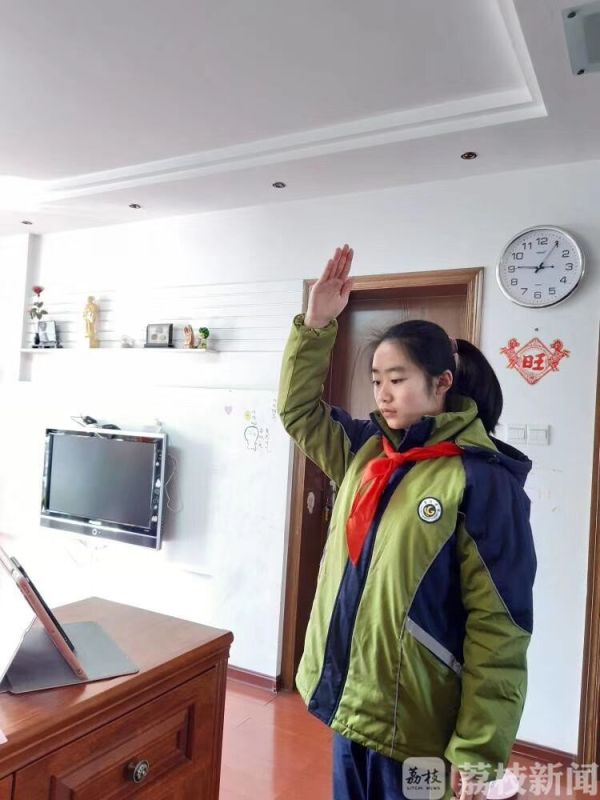 树人学校、扬州市梅岭中学教育集团竹西中学、翠岗中学、扬大附中东部分校、文津中学、朱自清中学、田家炳实验中学等多所学校的学生们早早穿戴整齐,各自在视频前准备就绪。8:30,升旗仪式正式开始。屏幕前国旗冉冉升起,队员们向国旗肃穆敬队礼。