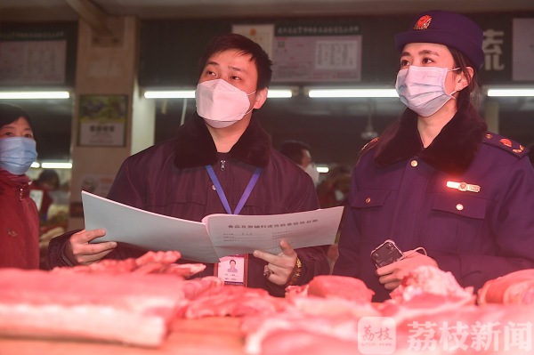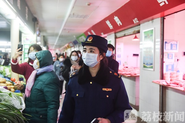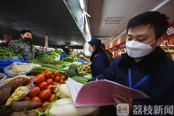 “今天生意还行哦?价格没涨吧?”“价格稳定”;“好,这个菜溢摊了,往里面收一收”;“你戴的口罩比较薄哦,来做生意还是戴个厚点的”“好,谢谢”……说话的是建邺区市场监管局南苑分局的崔斌,正在辖区内一处菜场摊位巡查。疫情爆发以来,连续十多天,每天早上7点前,家住方山的他已经出现在菜场内,赶在市场没开门前,检查防疫消杀做到位了没、是否存在菜价过高等情况。等市民涌入购菜,崔斌再一日几趟地巡场,快检室、经营规范都是检查重点。