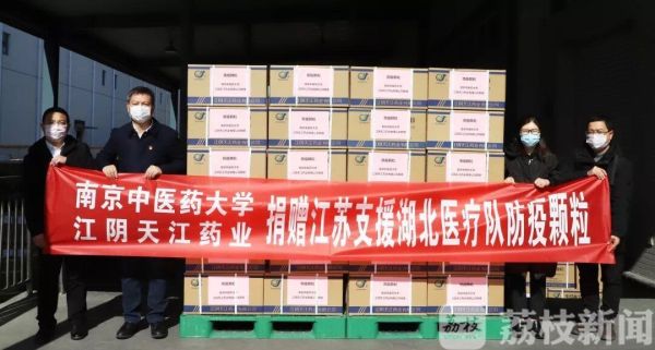 2月16日下午,由南京中医药大学和江阴天江药业共同捐赠的10320剂防疫颗粒带着生产线上的余温,被迅速打包装车,紧急发往江苏支援湖北医疗队在湖北各驻地。据了解,这批防疫颗粒将主要用于江苏援鄂医疗队医护人员的预防保健,为奋战在湖北疫情防控最前线的2497名江苏医务人员送去来自家乡人民的关怀。