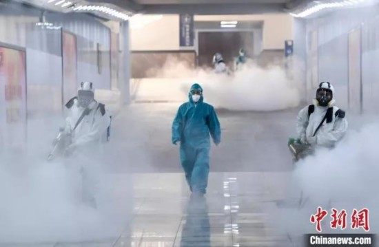 志愿者对长沙火车站通道进行消毒。杨华峰 摄