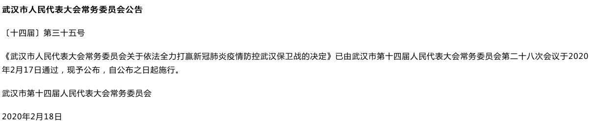 【武汉市人大常委会十项决定:不服从疫情管控可采取强制措施】