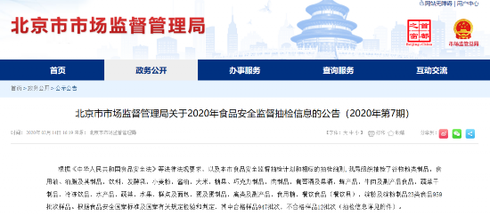 2月14日,北京市市场监督管理局公布了关于2020年食品安全监督抽检信息的公告(2020年第7期)。公告称,根据《中华人民共和国食品安全法》等法律法规要求,以及北京市食品安全监督抽检计划和相应的抽检细则,北京市市场监督管理局组织抽检了谷物粉类制品等23类食品959批次样品。其中合格样品947批次,不合格样品12批次。