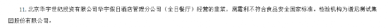 不合格样品12批次中的第11项显示,北京华宇世纪投资有限公司华宇假日酒店管理分公司(全日餐厅)经营的韭菜,腐霉利不符合食品安全国家标准。检验机构为谱尼测试集团股份有限公司。