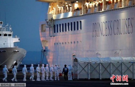 资料图:检疫人员正在准备对停泊在日本横滨港的“钻石公主”号邮轮进行检疫。