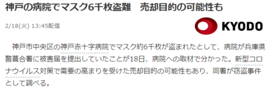 神户红十字医院于17日向警方报案,目前警方正在对此进行搜查。警方认为,目前口罩需求量大,偷窃者很可能是为了卖掉赚钱。