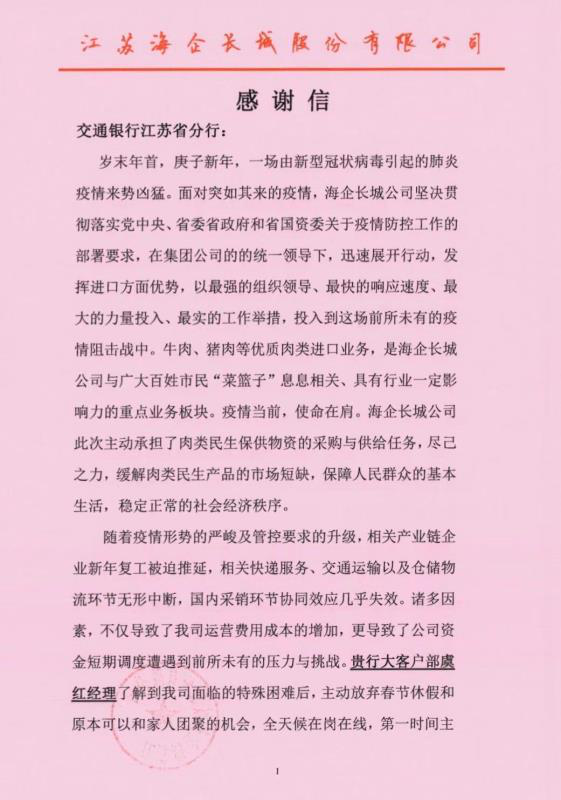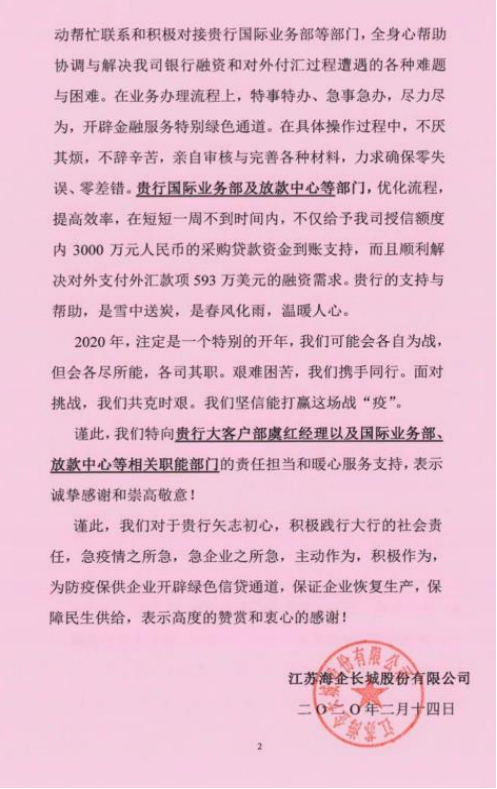 2月14日,交通银行江苏省分行收到了来自江苏省重点企业海企长城集团的一封感谢信,信中写道:“我们对于贵行矢志初心,积极践行大行的社会责任,急疫情之所急,急企业之所急,主动作为,积极作为,为防疫保供企业幵辟绿色信贷通道,保证企业恢复生产,保障民生供给,表示高度的赞赏和衷心的感谢!”