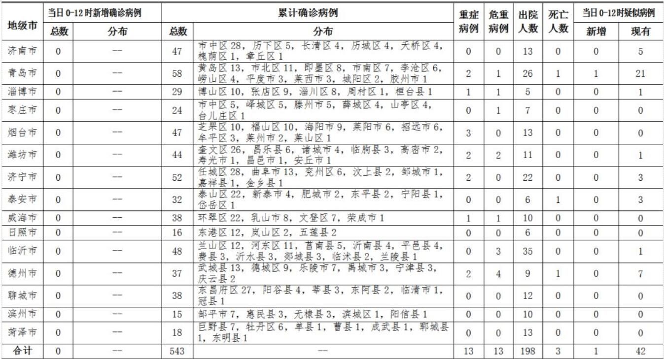 荔枝新闻讯 据山东卫健委,2020年2月18日0-12时,山东省无新增新型冠状病毒肺炎确诊病例,累计确诊病例543例(含重症病例13例,危重症病例13例,治愈出院198例,泰安市新报告死亡病例1例);新增疑似病例1例,现有疑似病例42例。截至目前,追踪到密切接触者16021人,已解除医学观察12852人,诊断为疑似或确诊病例289例,尚有2880人正在接受医学观察。