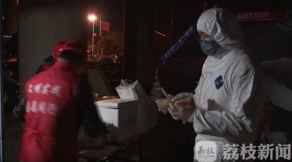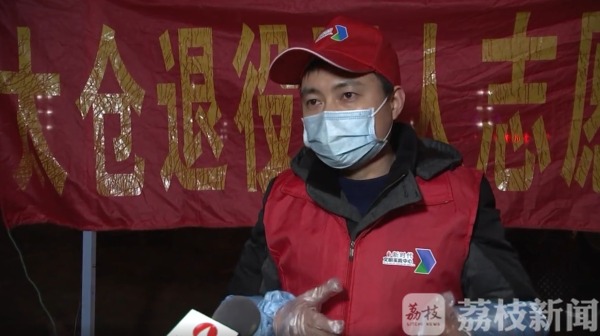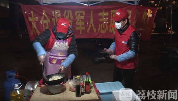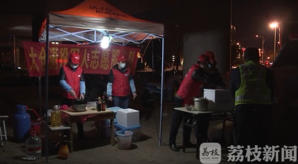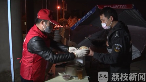 王善才是G15太仓城区出入口的一名志愿者,每晚一上岗就要持续值守6个小时,实在饿了累了,就和其他执勤人员轮流到隔壁天桥下吃一口热乎的:“特别是这两天降温,每天晚上温度比较低的时候,身体就要吃点东西。我们值班的点上是没有热水的,所以比较冷,来吃了他们的东西以后,就觉得心里暖暖的 。“