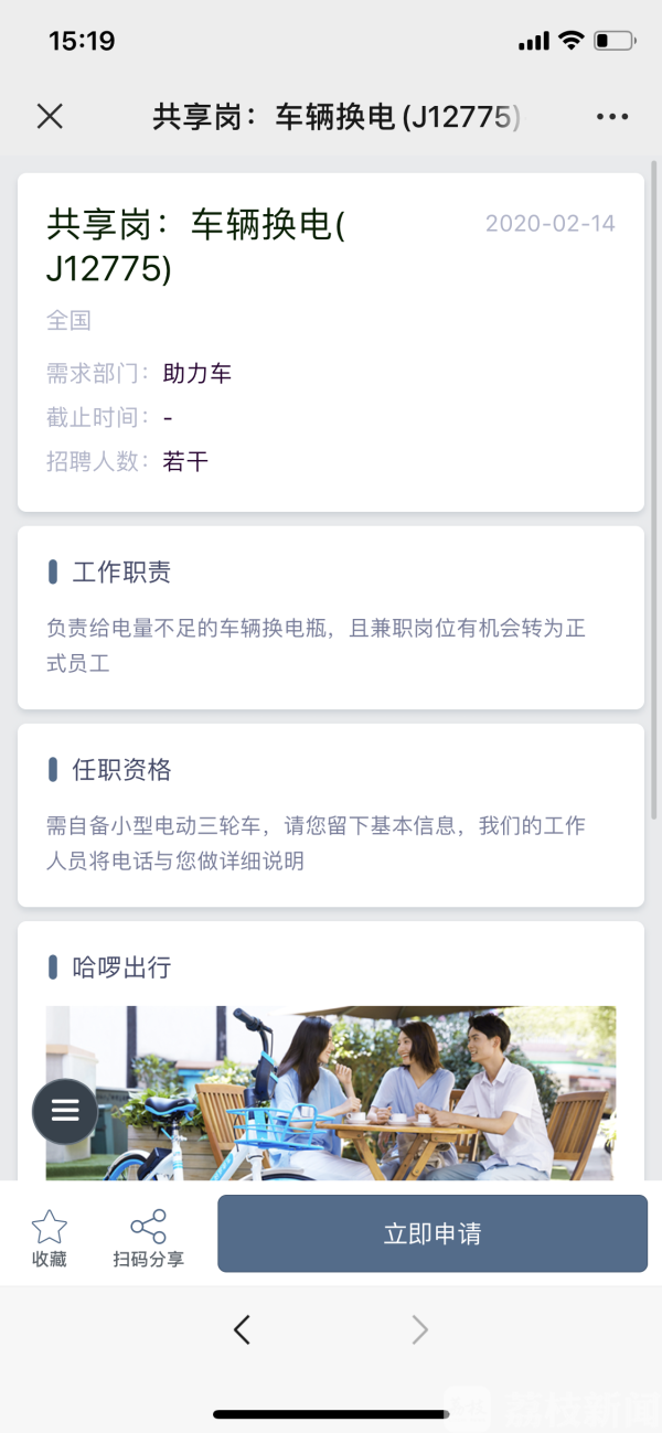 通过扫描哈啰出行岗位招聘二维码后,可以看到,有包括仓库维修等5个工种的共享岗位可供报名,仓库维修岗的任职资格一栏显示:需要会使用简单的维修工具。而车辆换电岗位则需要“自备小型电动三轮车”。仓库充电、车辆运维等岗位则是“零门槛”。