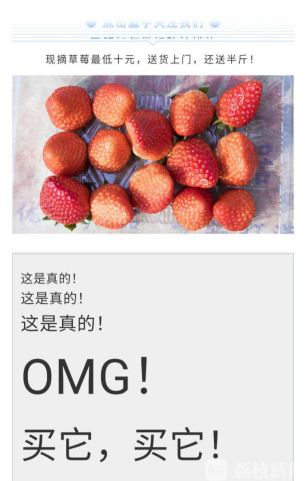 定好方案,交代了要求,夏志毅又发了一篇《现摘草莓最低十元,送货上门,还送半斤!》的文案。杨子兵对夏志毅说:“我也是第一次做线上销售, 如果半小时之内,阅读量超过50的时候有第一单,那就代表我们第一步做对了。”