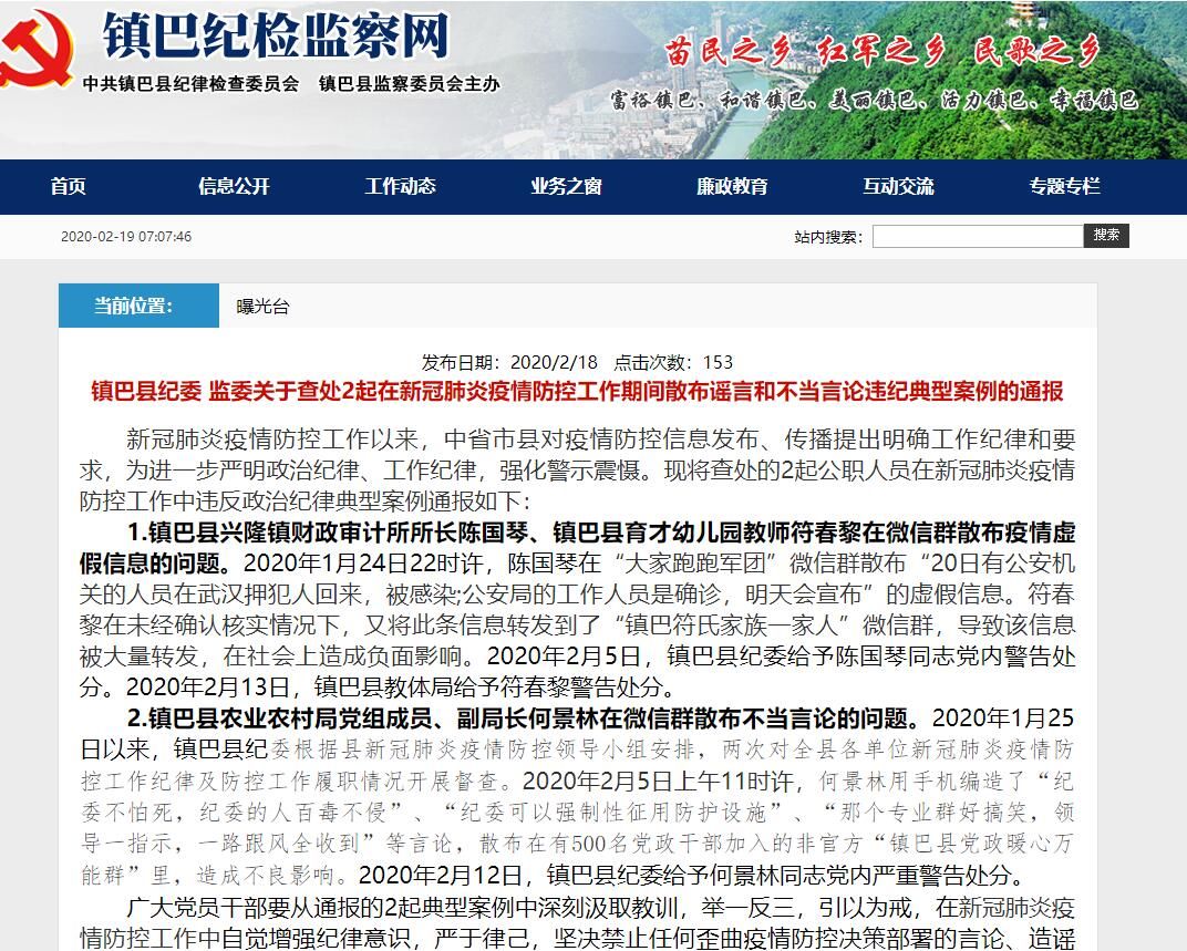 陕西省镇巴县纪委监委关于查处2起在新冠肺炎疫情防控工作期间散布谣言和不当言论违纪典型案例的通报