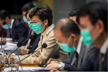 香港特首林郑月娥及其他官员戴口罩出席会议,图源:彭博社