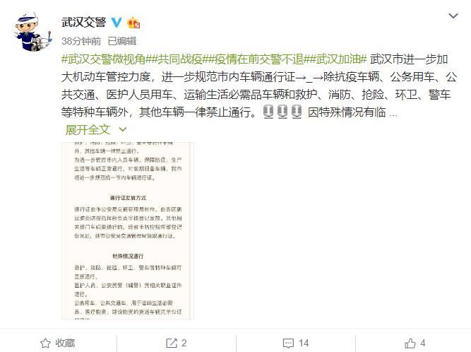 荔枝新闻讯 据武汉市公安局交通管理局微博消息,武汉市进一步加大机动车管控力度,进一步规范市内车辆通行证,除抗疫车辆、公务用车、公共交通、医护人员用车、运输生活必需品车辆和救护、消防、抢险、环卫、警车等特种车辆外,其他车辆一律禁止通行。因特殊情况有临时通行需求的,由所在单位(社区)出具出行事由证明,随车携带工作证件,可以通行。