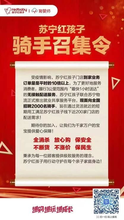 为了更好地服务消费者,解决部分停业人员的灵活就近的短期就业需求,苏宁红孩子联合苏宁物流正式推出就业共享服务平台,近期正式向全国招聘2000名骑手,通过线下近200家门店向消费者提供3公里范围内“最快1小时达”的无接触配送服务。“有工作意向的人员,可以通过苏宁红孩子小程序申请。”苏宁红孩子相关负责人表示。