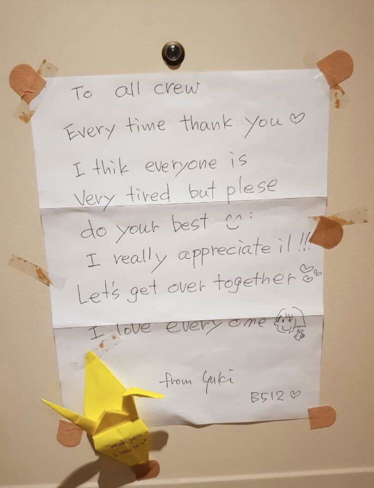 2月14日,邮轮上的情人节。浪漫的结婚礼堂空空荡荡,人们在停滞的时间里焦虑不安。餐食里还是有特别的情人节餐,船员努力维持着船上的平静。有人仍在抱怨,有人心存感激。邮轮的客舱门上,多了一些便条,有人对承担多个工种、连续无休的船员表示感谢。“他们也是受害者,不该被暴露在病毒里”,网友如是声援。