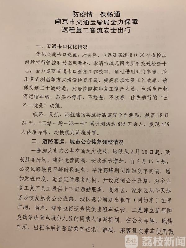 为保障返程复工客流安全出行,南京优化交通卡口设置,对省界、市界以及高速出口68个查控点继续实行管控和动态调整外,取消市域范围内所有交通检查卡点。南京市交通运输局副局长郑春发:“通过借用对向车道、采用复式测温等方式增设检查车道,提高现场检测工作效率,确保交通主干道畅通。对疫情防控和复工复产人员、生活生产物资运输车辆,落实不停车、不检查、不收费、优先通行的‘三不一优先’政策。”